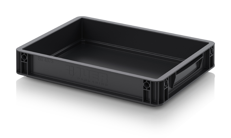 Евроконтейнер с ESD-защитой производства компании AUER Packaging изготавливается из антистатической пластмассы, что делает его пригодным, в частности, для надежного хранения и транспортировки электронной продукции.