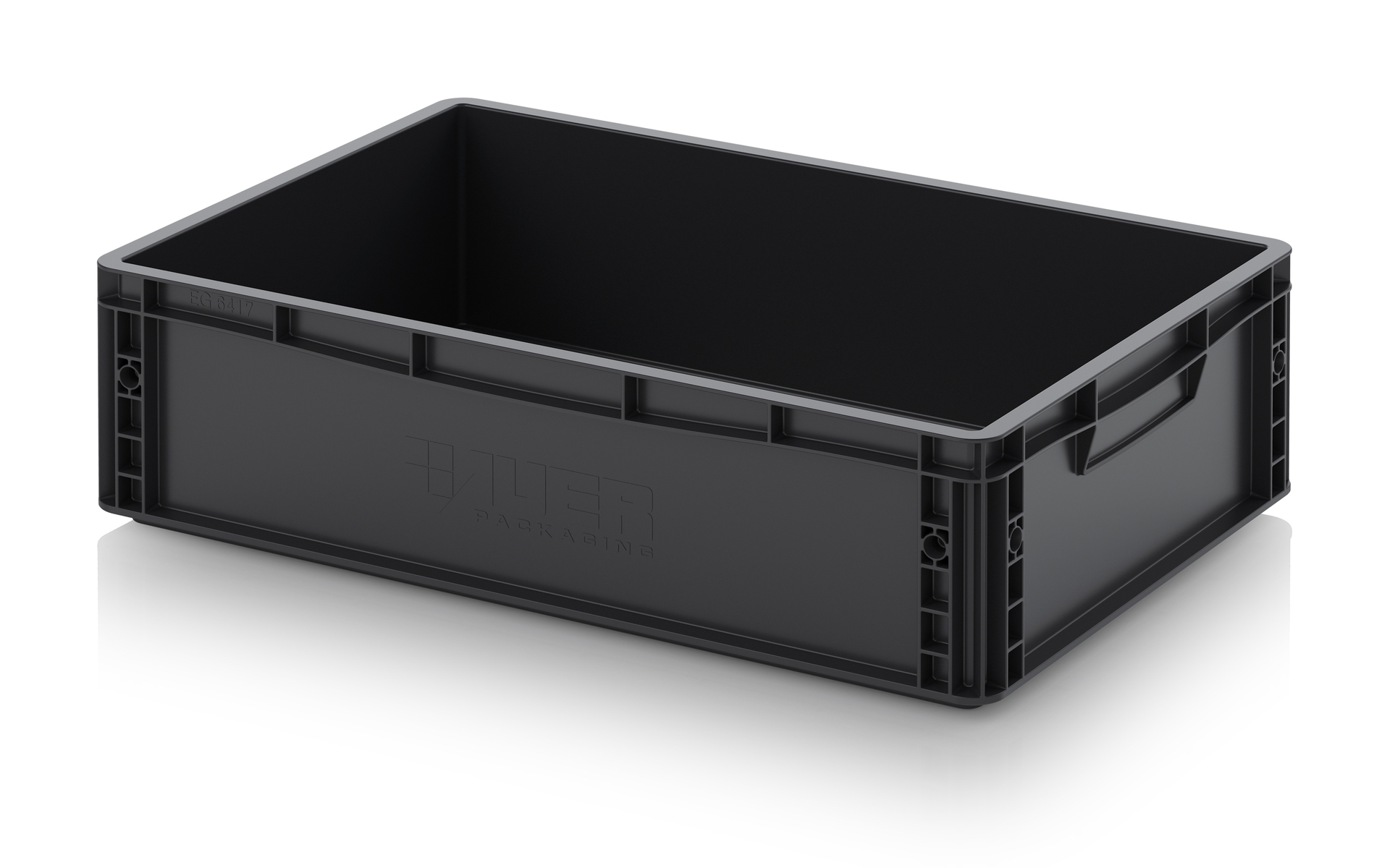 Евроконтейнер с ESD-защитой производства компании AUER Packaging изготавливается из антистатической пластмассы, что делает его пригодным, в частности, для надежного хранения и транспортировки электронной продукции.