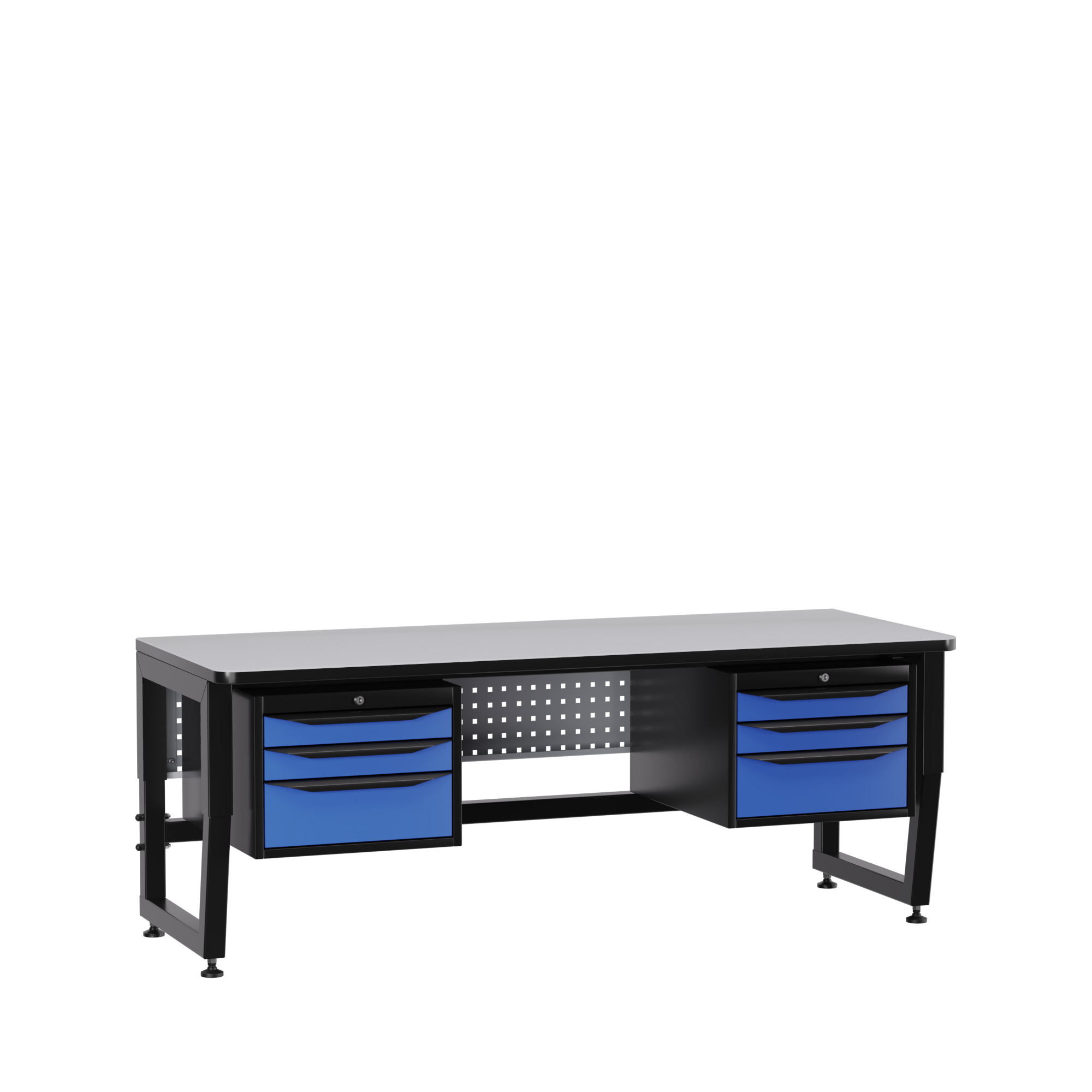 Несущая конструкция стола – это промышленный ESD каркас. Сочетание опорных, несущих и усиливающих элементов из металла, обеспечивают высокую надежность конструкции при интенсивной промышленной эксплуатации с распределенными нагрузками на рабочее место до 300 кг. Регулируемые опоры с возможностью плавной регулировки по высоте позволяют установить удобную высоту рабочей поверхности от 700мм до 850мм. Специальное ESD полимерное покрытие элементов каркаса с сопротивлением 1 МОм обеспечивают антистатические свойства изделия