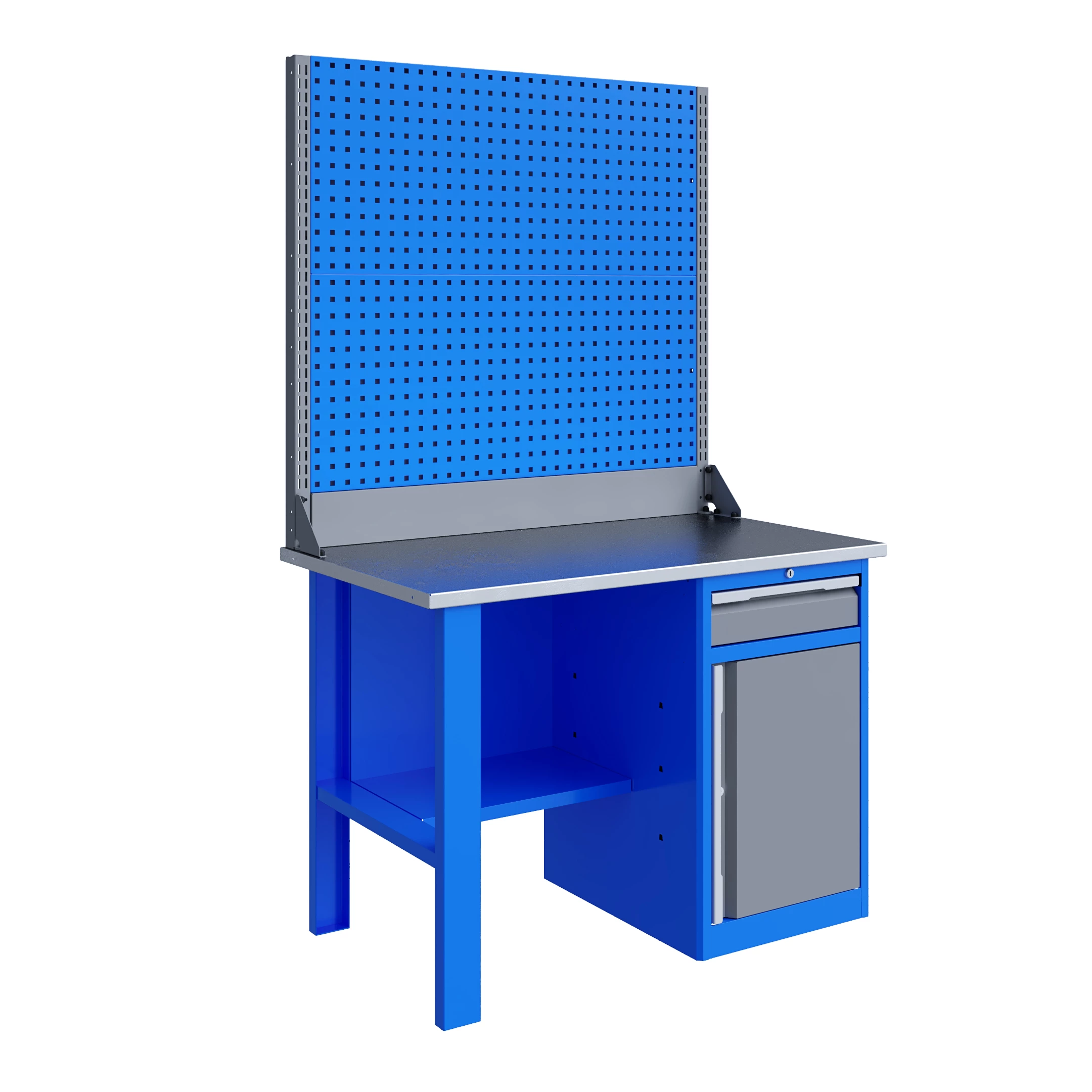 Двойной экран (перфорированные панели) верстака выполнен с квадратной перфорацией 12х12 мм с шагом 38 мм для установки крючков, держателей и других аксессуаров. Экран крепится к столешнице с помощью специальных кронштейнов. Максимальная масса груза, равномерно распределенного по поверхности экрана, составляет 21 кг.