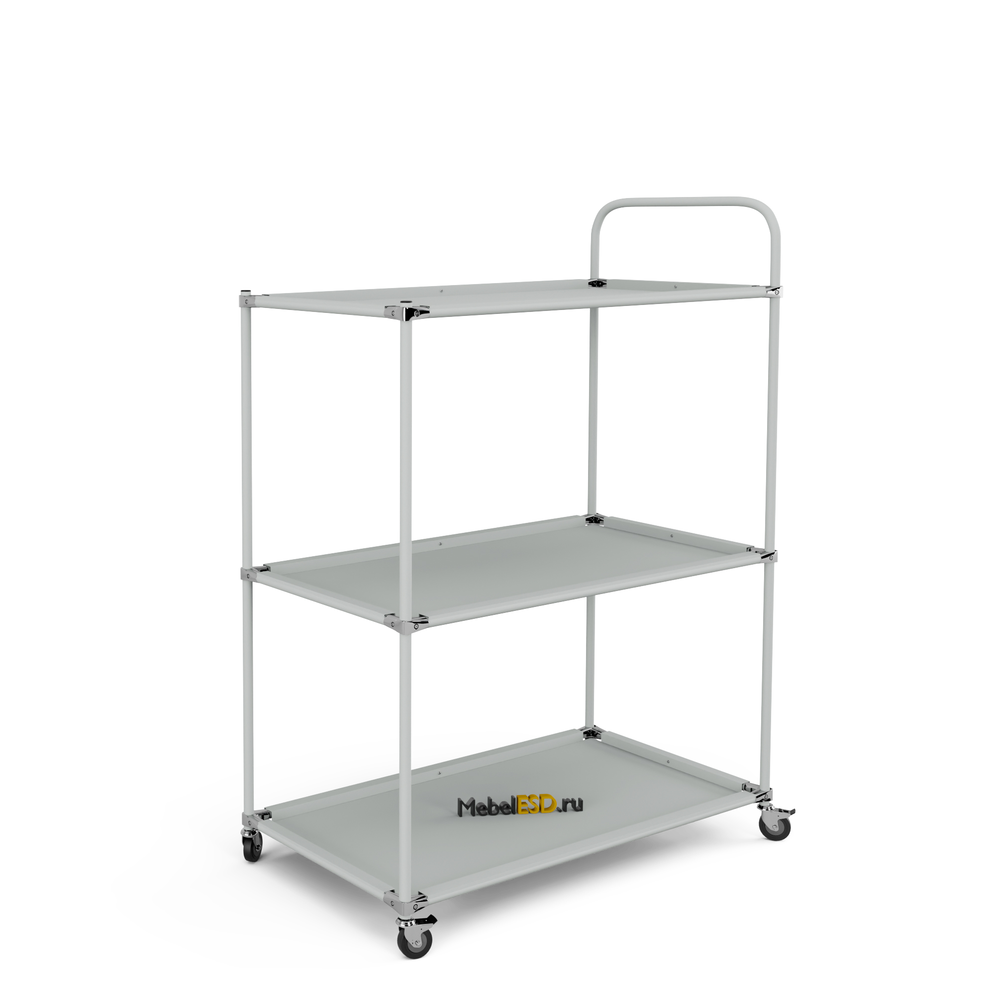 Тележка металлическая ТМУ предназначена для перемещения в рабочей зоне продукции, комплектующих, приборов и оборудования. Тележка оснащена тремя полками, которые раздельно регулируются по высоте, и четырьмя колесными опорами, две из которых с механизмом фиксации. Каркас тележки выполнен из трубы диаметром 25 мм, толщина стенок — 1.2 мм. Полки изготовлены из листового металла. Конструкция обладает высокой стойкостью к термическим и механическим нагрузкам. Распределенная нагрузка на полку — до 40 кг, на тележку — до 100 кг. Конструкция тележки позволяет оснастить ее дополнительными полками.